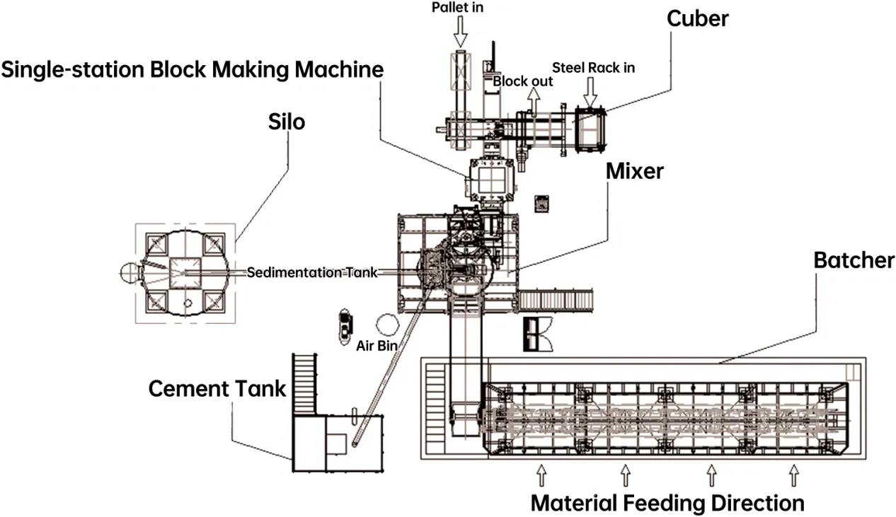 Baris produksi entuk formulasi bahan sing tepat liwat sistem batch lan nyawiji. Bahan sing disampaikan liwat Sabuk lan diangkat dadi mixer, ing ngendi nyawiji kanthi lengkap sadurunge ditransfer menyang midrat material sing madhep. Tabel pers utama sing metu, lan sajrone dipakani bahan lumahing, dosis hopper kanthi tepat nyebarake bahan menyang pigura cetakan ing meja geser. Milih banjur obah ing ngisor pigura pers kanggo pers filtrasion sing mbentuk. Kangge, palet dikirim menyang posisi sekunder meja kanthi feeder palet. Sajrone siklus dosis sabanjure, bata sing dibentuk kanthi otomatis ditabuh kanthi otomatis. Sistem synfronously ngrampungake palet dipakani lan ngilangi bata teles sajrone proses mencet, njamin efisien lan produksi sing efisien lan terus-terusan.