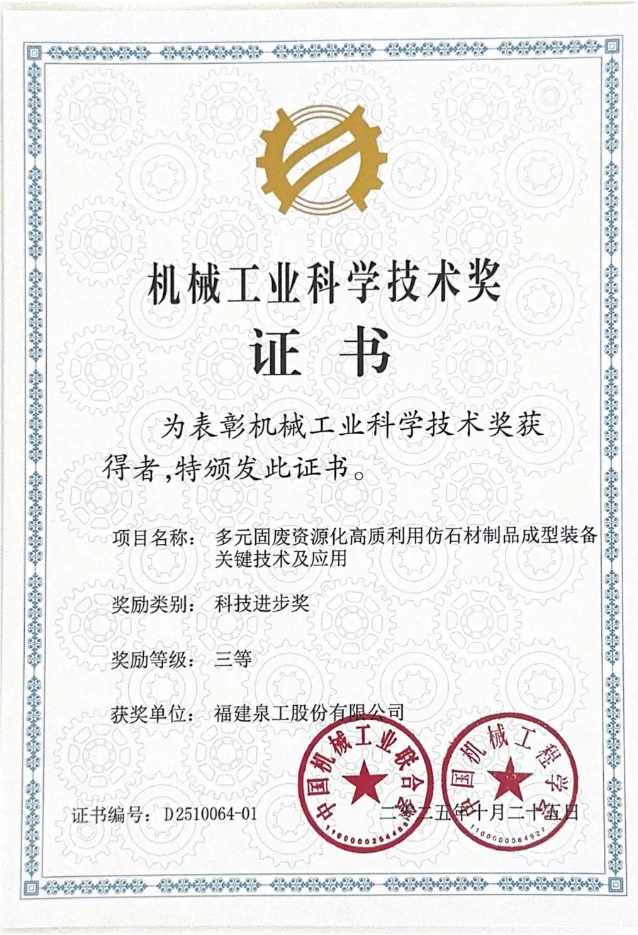 Bubar, dhaptar pemenang kanggo Penghargaan Ilmu lan Teknologi Industri Mesin China 2025 diumumake kanthi resmi. Proyèk "Teknologi Kunci lan Aplikasi Pembentukan Peralatan kanggo Pemanfaatan Bernilai Tinggi saka Sumber Daya Limbah Padat sing Diversifikasi dadi Produk Batu Simulasi," sing dipimpin Fujian Quangong Machinery Co., Ltd., menang hadiah katelu kanggo kemajuan teknologi. Penghargaan iki kanthi lengkap nuduhake pangenalan sing dhuwurQuangong Machinery Co., Ltd.Kapabilitas inovasi teknologi lan prestasi aplikasi teknik ing bidang pemanfaatan sumber daya limbah padat lan peralatan pembentuk cerdas kanggo produk watu simulasi.