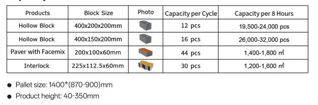 Peralatan kasebut ngasilake macem-macem produk bata kothong, kalebu macem-macem jinis fungsional kayata blok biasa, blok dekoratif, lan blok insulasi. Wangun bolongan kalebu bolongan kothak lan bunder, lan susunan bisa entuk struktur bolongan siji-baris, pindho, lan multi-baris. Kanthi ngganti cetakan utawa nyetel paramèter peralatan, macem-macem jinis produk bata bisa diowahi kanthi fleksibel kanggo nyukupi panjaluk pasar sing beda-beda.