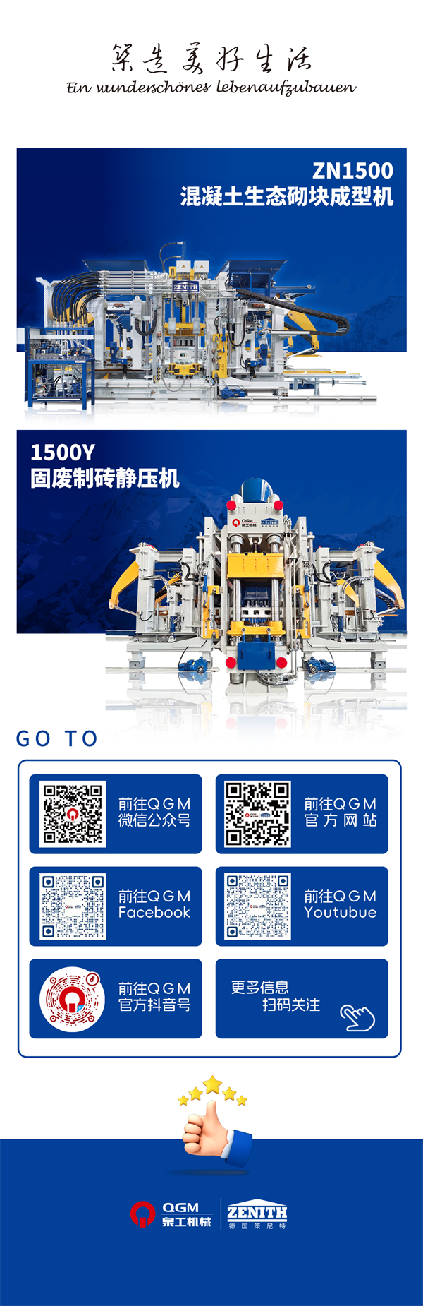 Minangka merek utama ing industri mesin bata ing domestik, QGM wis konsisten ana ing antara perusahaan utama ing Quanzhou sajrone pirang-pirang taun. Nganti saiki, perusahaan wis aman luwih saka 300 paten produk, 21 yaiku paten penemuan sing diwenehake dening kantor properti intelektual negara. Ing taun 2014, perusahaan kanthi lengkap entuk Zenith, produsen Jerman Jerman sing gratis ing jagad iki kanthi luwih saka 60 taun sejarah, resmi ngluncurake ekspansi strategis global. Kanthi nggabungake teknologi Jerman lanjutan kanthi lengkap lan nggunakake pirang-pirang taun pengalaman manufaktur, QGM terus-terusan nuntun lan ngembangake pirang-pirang model sing kompetitif internasional. Produk iki diekspor dadi luwih saka 60 negara lan wilayah ing sadawane sabuk lan inisiatif dalan, entuk pangenalan ing pasar global.